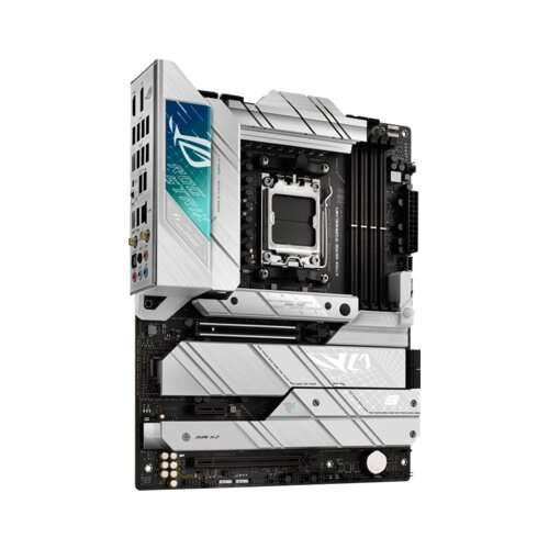 The ROG Strix X670E-A Gaming WiFi will turn heads with a striking silver-white finish that contrasts with a bold Aura RGB-illuminated grid design. Parallel strakes and curved text on the VRM, M.2, and PCH heatsinks tie the whole aesthetic together with a clean, modern look.