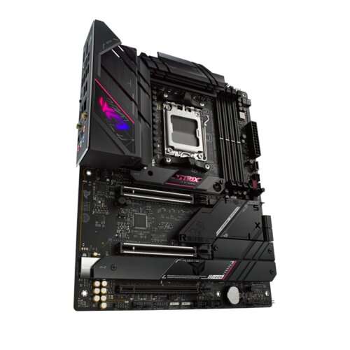 Bold and elegant, the ROG Strix B650E-E bears a premium aesthetic similar to the Electro Punk peripheral series. Black shrouds cover the SSDs and chipset with contrasting powder-coated and brushed metal textures, and playful pink accents draw the gaze around the board. The I/O shroud is emblazoned with a split image of the ROG eye, the center of which can shine with a splash of customizable RGB.