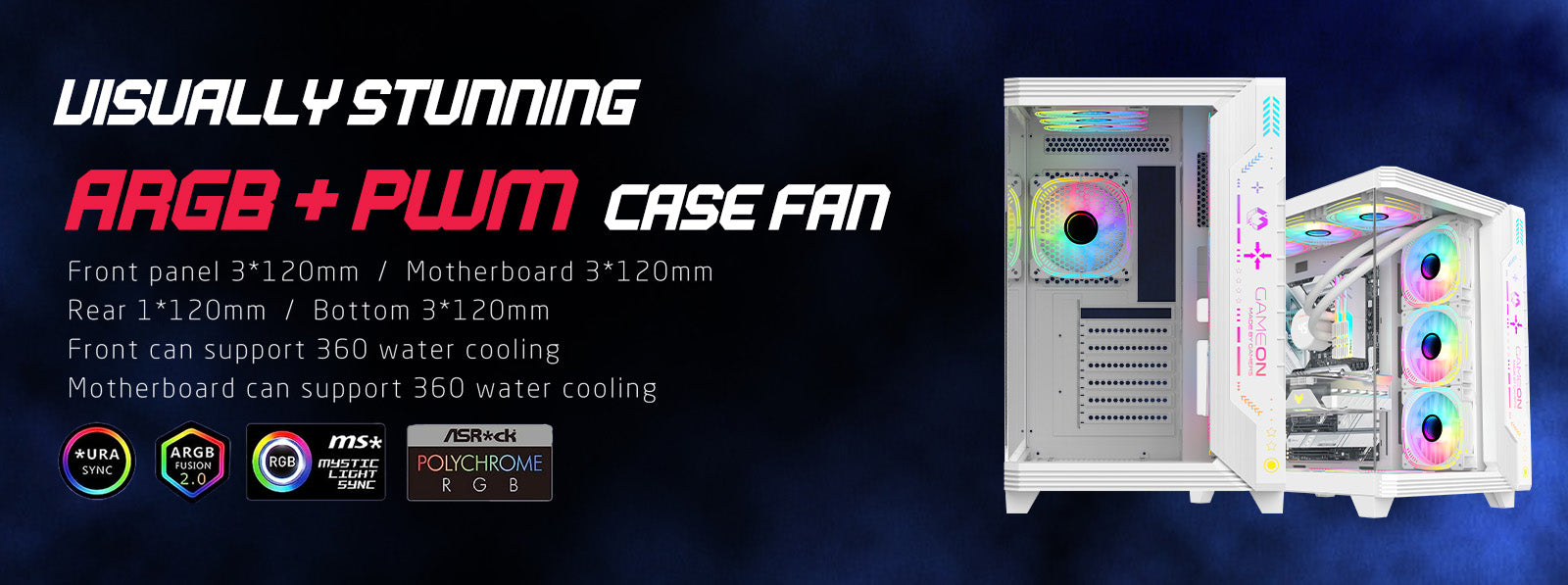 | General Information | Motherboard Compatibility: ATX / M-ATX / ITX Tempered Glass: Yes Lighting Type: ARGB + PWM Pre-Installed Fans: 7 × 120mm ARGB + PWM Materials: SPCC |