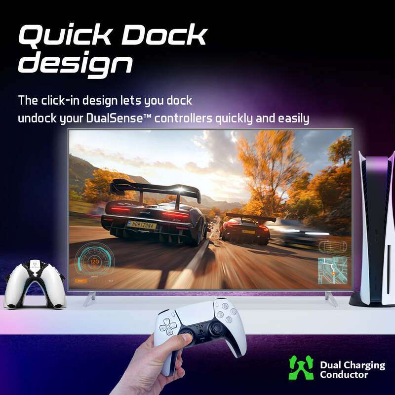 Keep your DualSense™ controller always charged up and ready to go with DualDock-PS5. Charge 2 controllers simultaneously without connecting them to your console. Dock the controllers in a single click and leave them to charge at your convenience. Stay charged up and ready to go with DualDock-PS5
